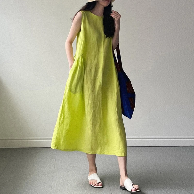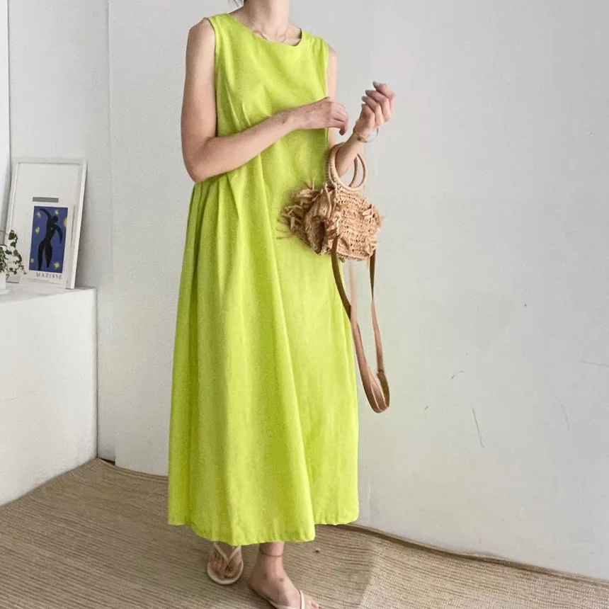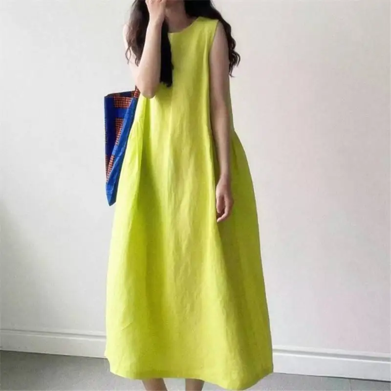 Cotton Linen Sleeveless Dresses Woman Clothing Loose Solor O-Neck Long Dress Ladies Casual Robes New Y2k Colors Summer Sundress